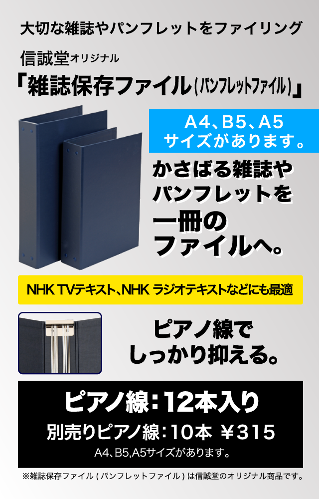 積もる雑誌やパンフレット。整理がつかなくてお困りではありませんか?雑誌保存ファイル(パンフレットファイル)はNHK TVテキスト、NHK ラジオテキストなどにも最適なファイルです。